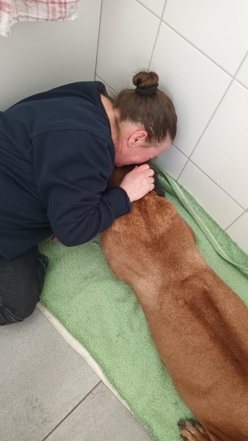 Es kam der Tag, an dem wir für uns entschieden haben, ihn gehen zu lassen. Da Euthanasie in Deutschland aber strikt geregelt ist, baten wir unsere Tierärzte um ihre Meinung. Drei Tierärzte schauten sich den Hund an, und sie entschlossen sich, ihn sofort gehen zu lassen. Er bekam eine Spritze, um ihn zu sedieren und zu beruhigen. Er drehte den Kopf zu Wand und wollte nicht mehr. Sabine umarmte ihn während man versuchte, im intravenös die entsprechenden Medikamente zu verabreichen. Sein Zustand war so schlecht, das man keinen Zugang mehr legen konnte. Sein Blutdruck war zu gering, sein Blut so dick, dass es nicht funktionierte. Die Tierärzte schauten mich mit Tränen in den Augen an und sagten nur ein Wort, während sie Richtung meiner Frau blickten, die am Boden kniete und Tränen über Davu ergoss: “intrakardial”.