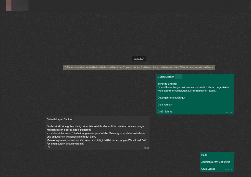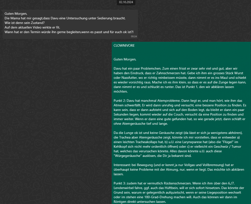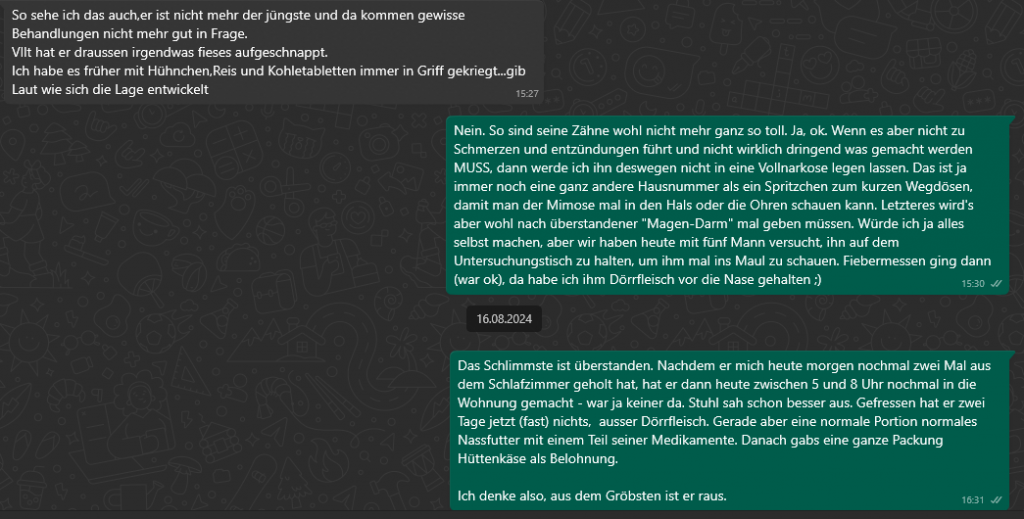 Ich verweise hier nochmal auf den Text der Eigentümerin: “Wollt ihr weitere Untersuchungen machen lassen oder es dabei belassen? Ich stehe zu eurer Entscheidung, meine persönliche Meinung ist, es dabei zu belassen und abzuwarten wie lange es ihm gut geht”.