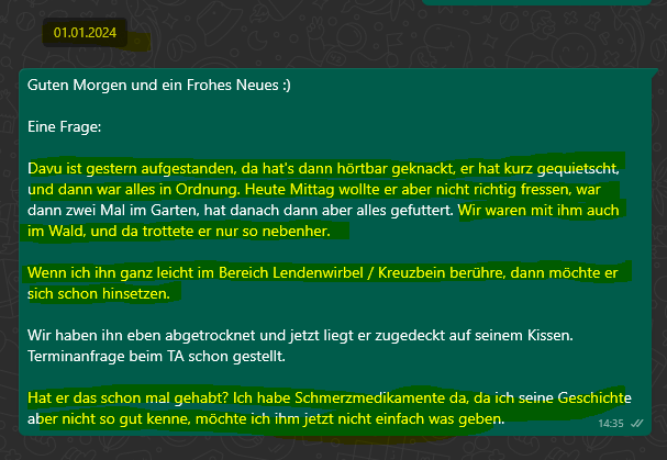 In den kommenden Monaten war der (nicht ganz so gute) Zustand konstant: Davu bekam bei Bedarf Schmerzmedikamente und Physio. Bis dann im August 2024: