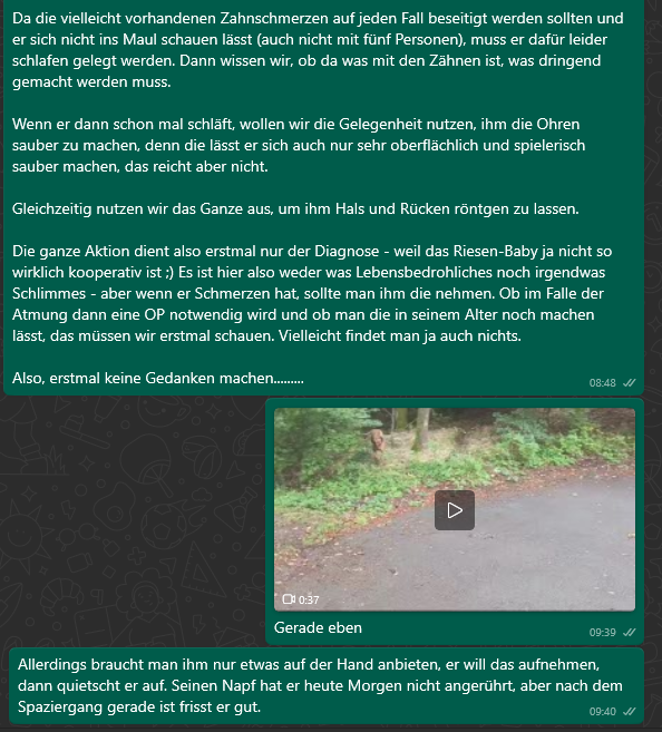 Wie immer informierten wir die Eigentümerin über den Zustand des Hundes. Neben den üblichen Problemen kamen nun andere hinzu. Und wir deuteten an: wenn die Magen-Darm-Probleme ausgestanden sind, kommen wir nicht umhin, mal genauer zu schauen, was mit ihm nicht stimmt. Dazu muss er aber mal schlafen gelegt werden, denn er lässt überhaupt nichts mit sich machen.