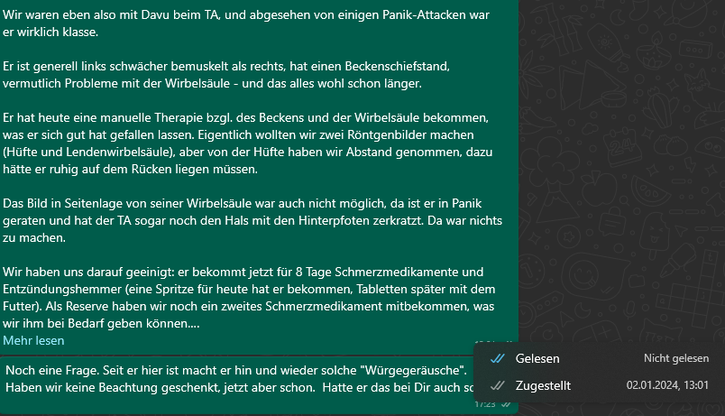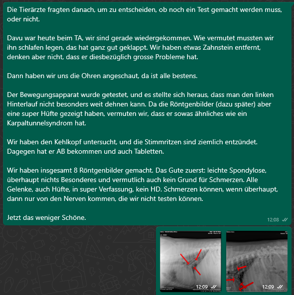 Ich möchte nebenbei erwähnen, dass es für uns natürlich auch belastend ist, ein Tier so leiden zu sehen, und man sich hier Gedanken macht, welche Diagnosen notwendig und möglich sind, welche Therapien, wie man ihm das Leben verbessern und erleichtern kann. Das geht nicht spurlos an einem vorüber.