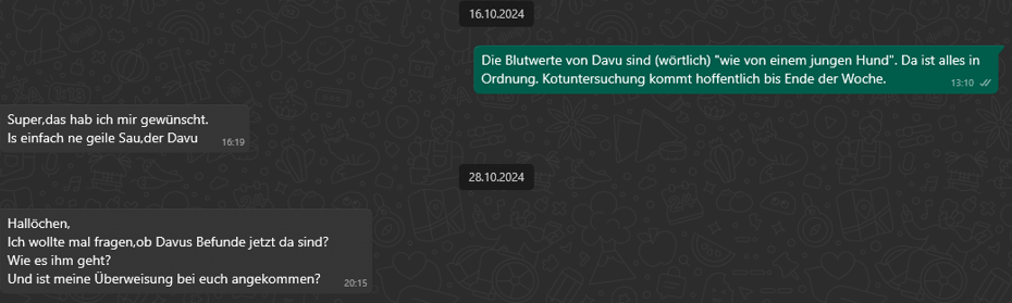 Am 16.10. teilte ich mit, dass die Blutwerte in Ordnung sind, die Werte der Kotuntersuchung würden noch dauern.
