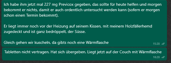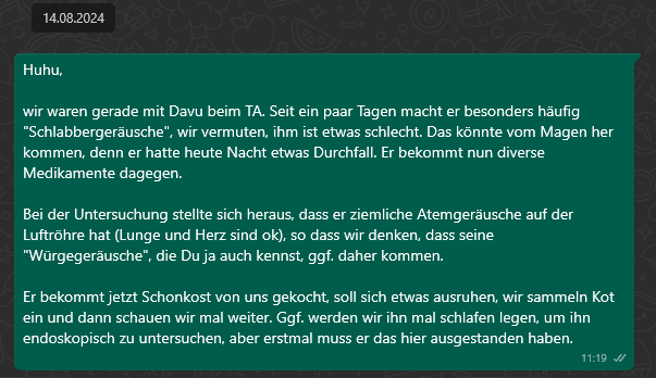 Davu hatte wirklich massive Atemprobleme (nur im Liegen), und wurde dann ganz unruhig. Und auch hier wieder der Hinweis: die “Würgegeräusche” waren bekannt. Die Schmerzen waren auch nicht besser geworden, im Gegenteil.