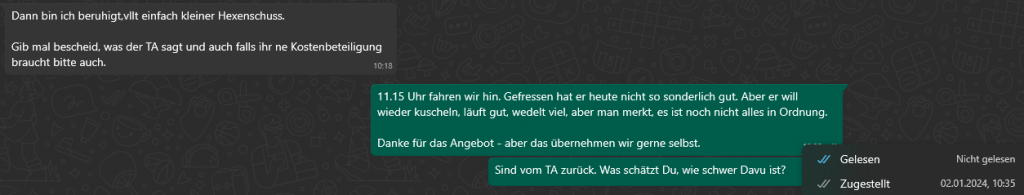 - wir informieren sie über jeden Schritt, weil wir dachten, ihr liegt was an dem Hund, und selbst das ist ihr zu viel (“Du schreibst immer so viel, habe ich gar nicht alles gelesen”)