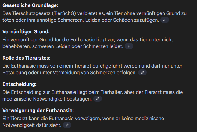 Meine Frau und ich haben uns ethisch dazu entschieden, Davu zu euthanasieren. Ich habe das fachlich durch mein vet.-med. Studium ebenso gesehen. Die Euthanasie darf nur von einem Arzt durchgeführt werden, der ich nicht bin:
