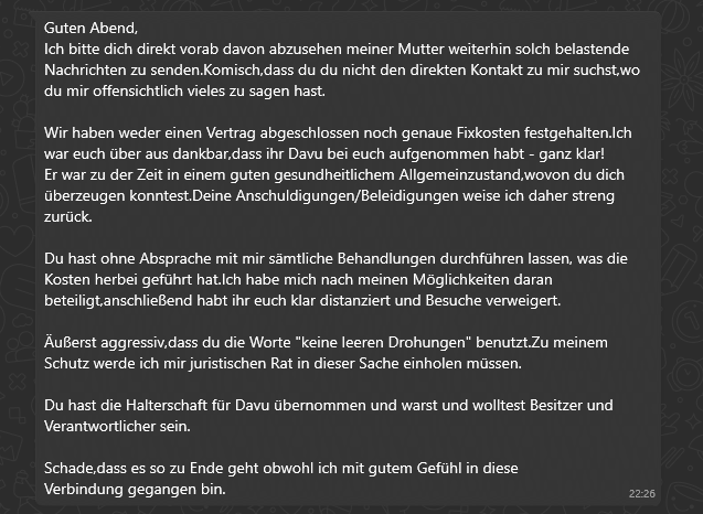 Es kam der 20.06.2025. Bis hier hin keine Reaktion. Da sich die Mutter der Eigentümerin ja aktiv um die Vermittlung von Davu bemüht hatte, alle Hebel in Bewegung gesetzt hatte, um an unsere Adresse / Telefonnummer zu kommen, sollte sie ruhig wissen, was für eine tolle Tochter sie hatte. Ich informierte sie also über die Situation und schilderte die letzten Monate. Und ich teilte ihr mit, dass ich nicht zu den Leuten gehöre, die leere Drohungen aussprechen. Wenn ich sage, ich bringe jemanden vor Gericht, dann meine ich das so.