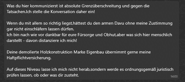 Ich habe geantwortet (aufgrund der Länge des Textes mal keine WhatsApp-Screenshots, aber die kann ich einem Gericht gerne vorlegen):