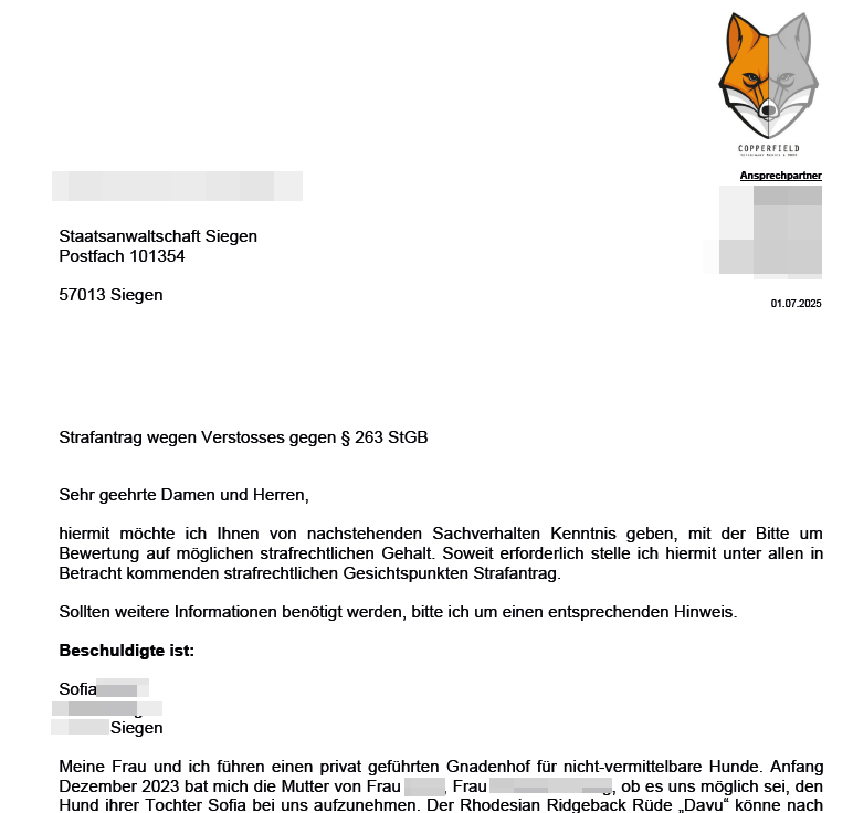 - Strafantrag wegen Betruges wird gestellt (wer weiss, dass er nur 100 Euro bezahlen kann, der hatte nie vor, die Kosten für den Hund zu tragen und uns getäuscht)